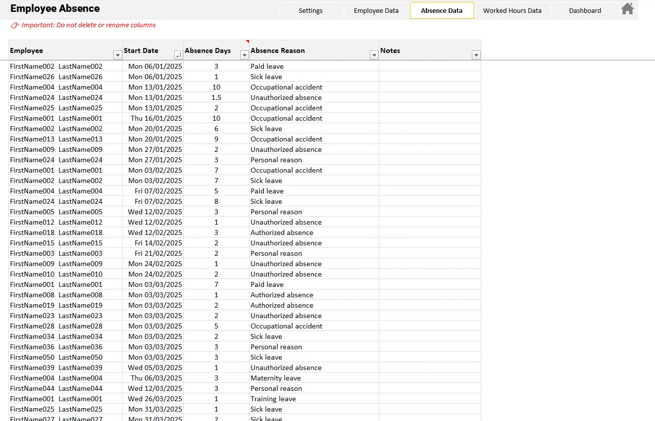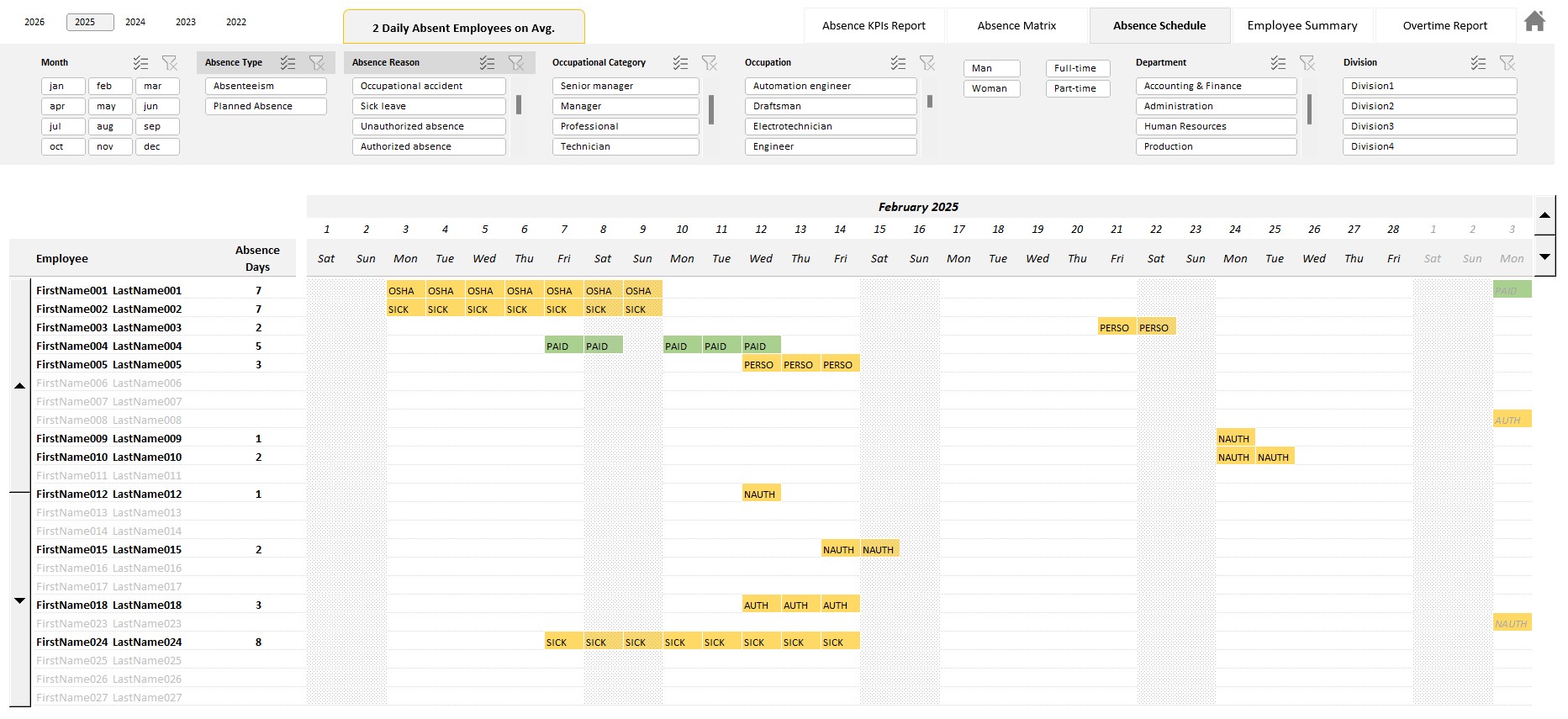 • Total number of absence days by employee, categorized by absence type: planned absence, and absenteeism