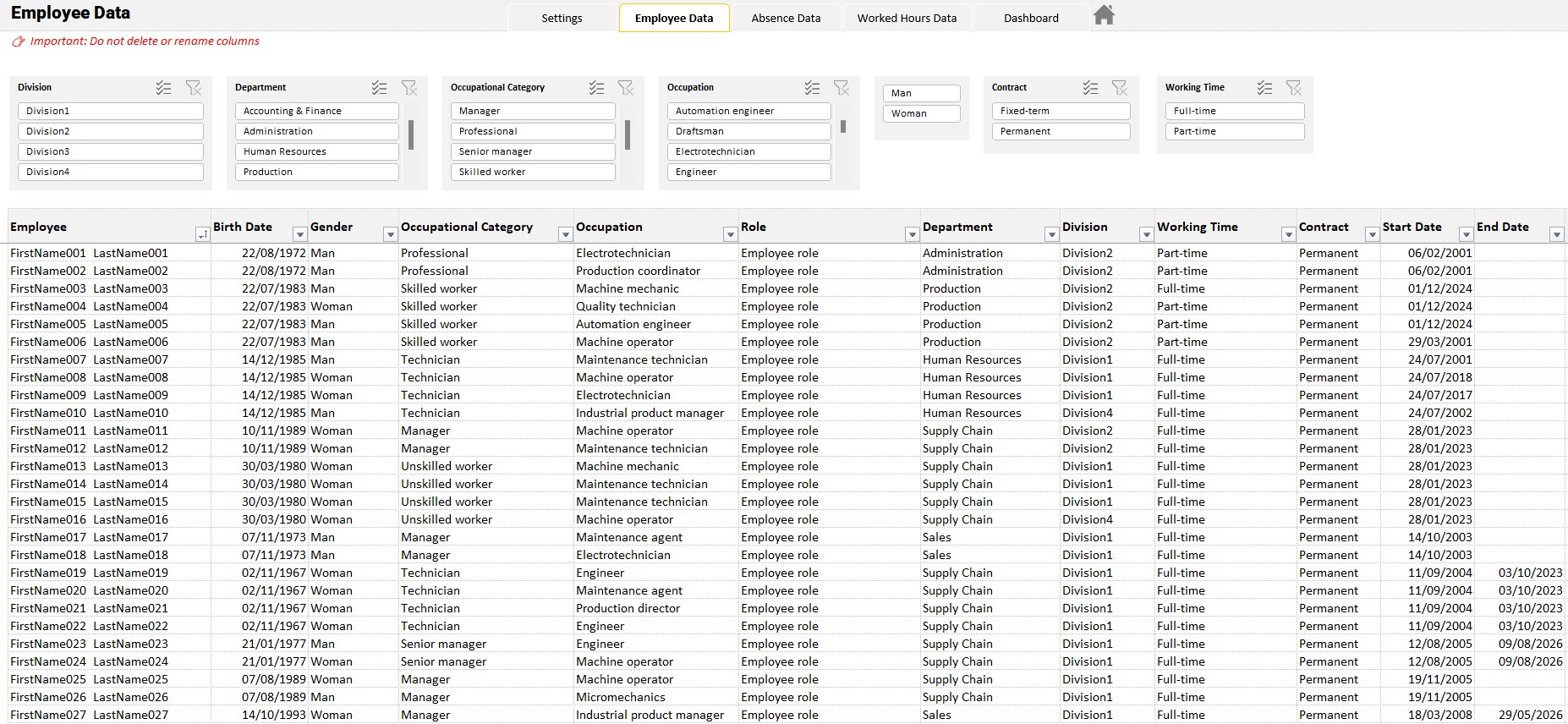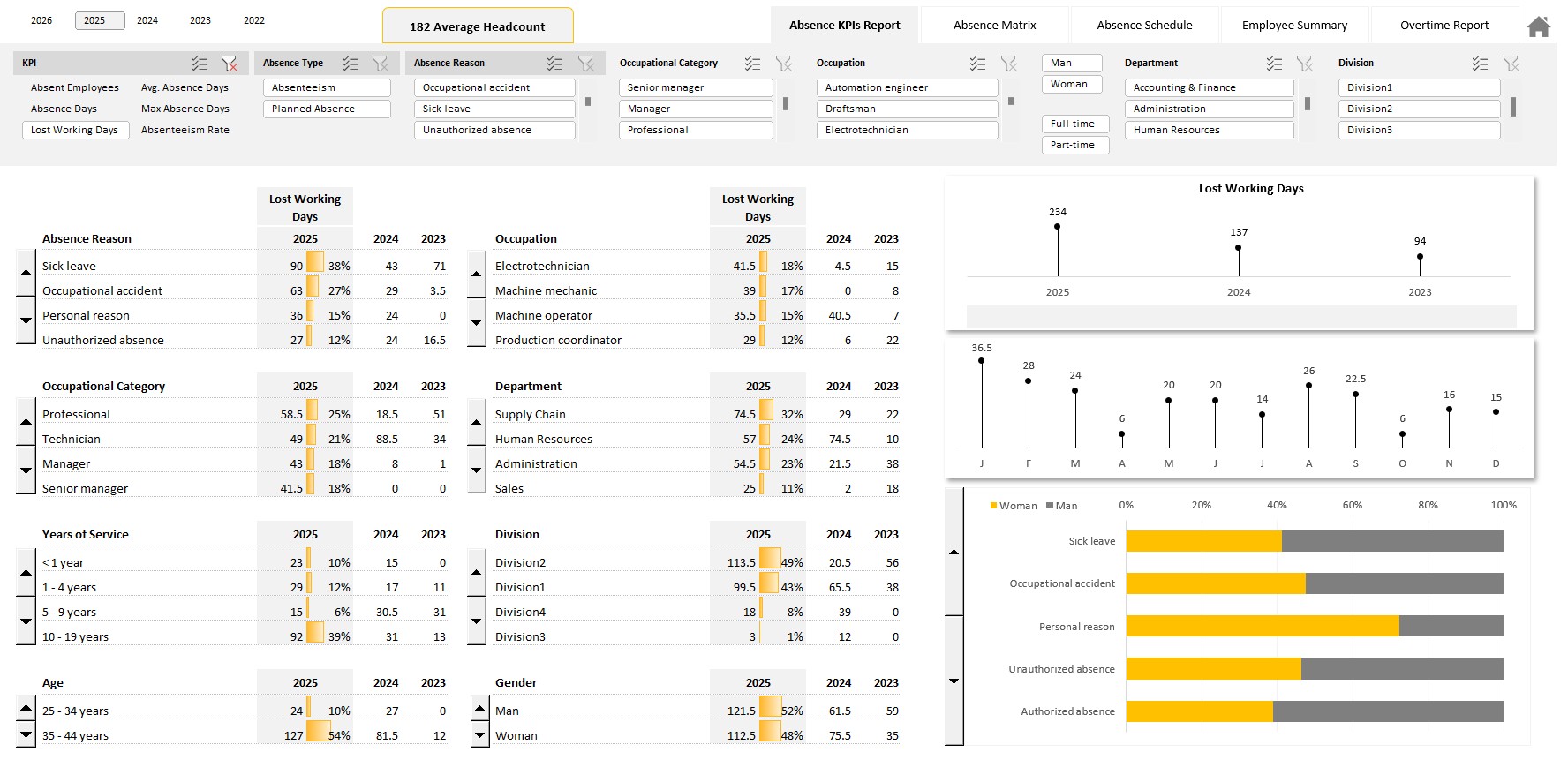 • Number of absent employees, total absence days, average and maximum absence days, lost working days and absenteeism rate (lost time rate)