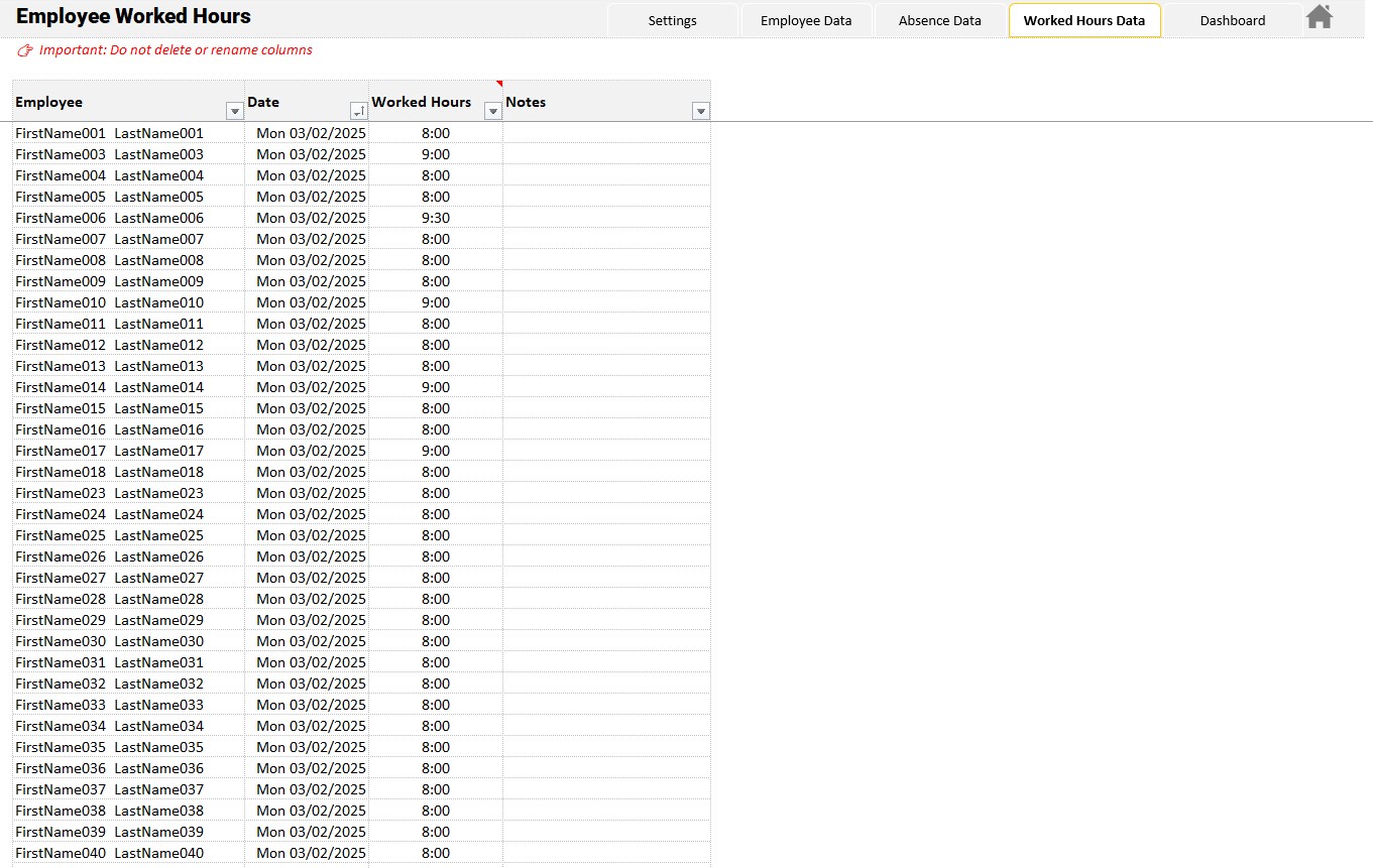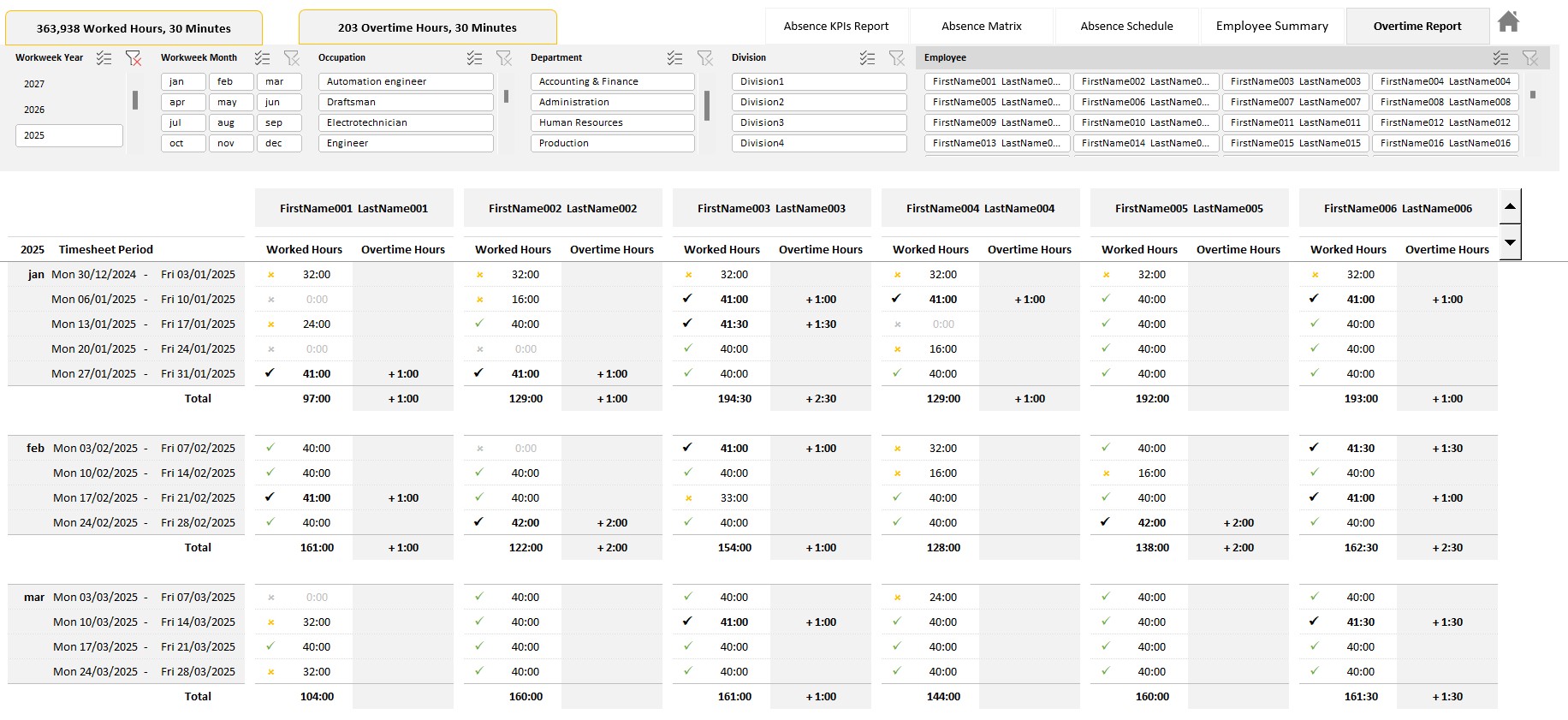 • Monthly worked hours, and overtime hours, by employee