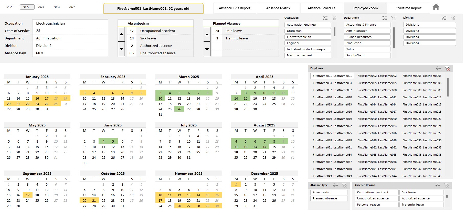 • Absence calendar by employee: displays employee absences for the entire year, type of absence, start and end dates