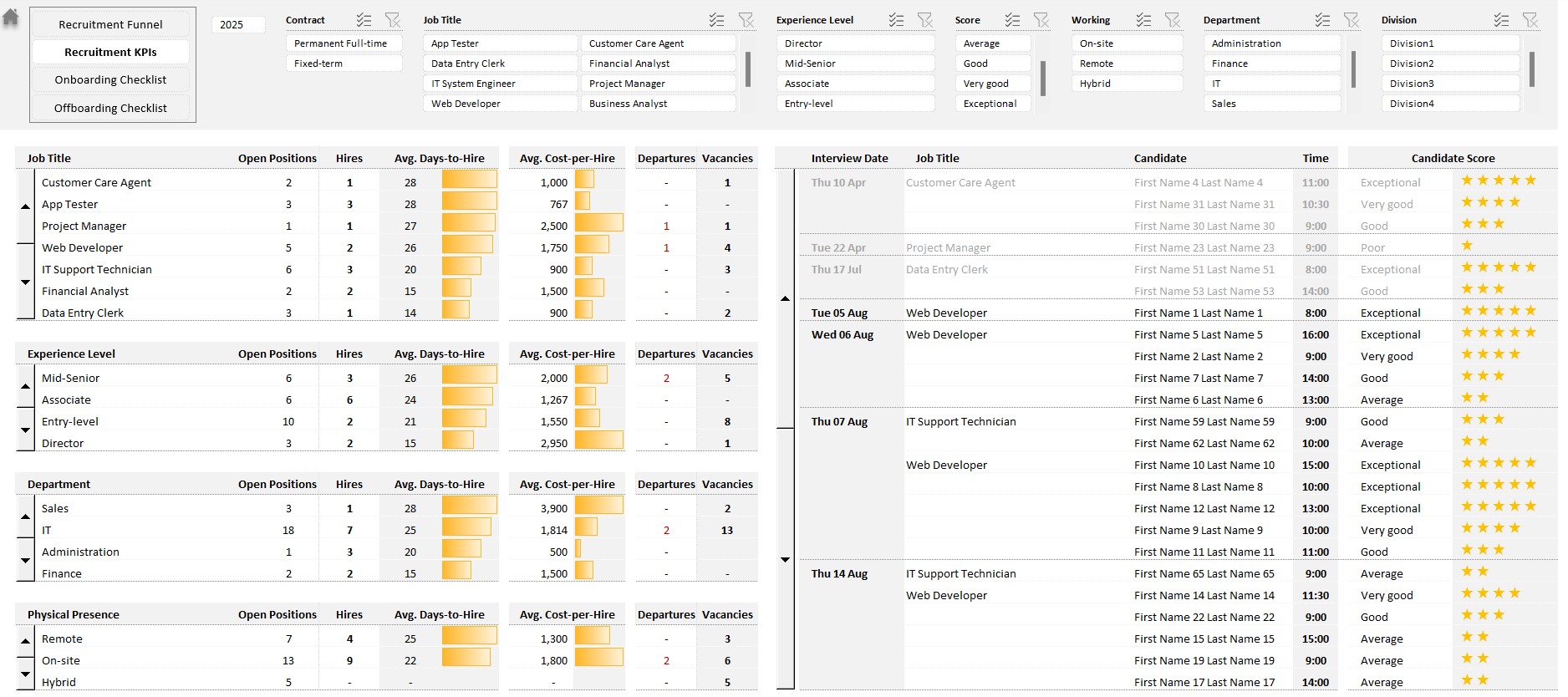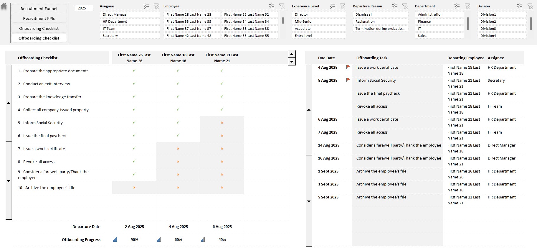 Recruitment Dashboard, Onboarding Checklist, Offboarding Checklist